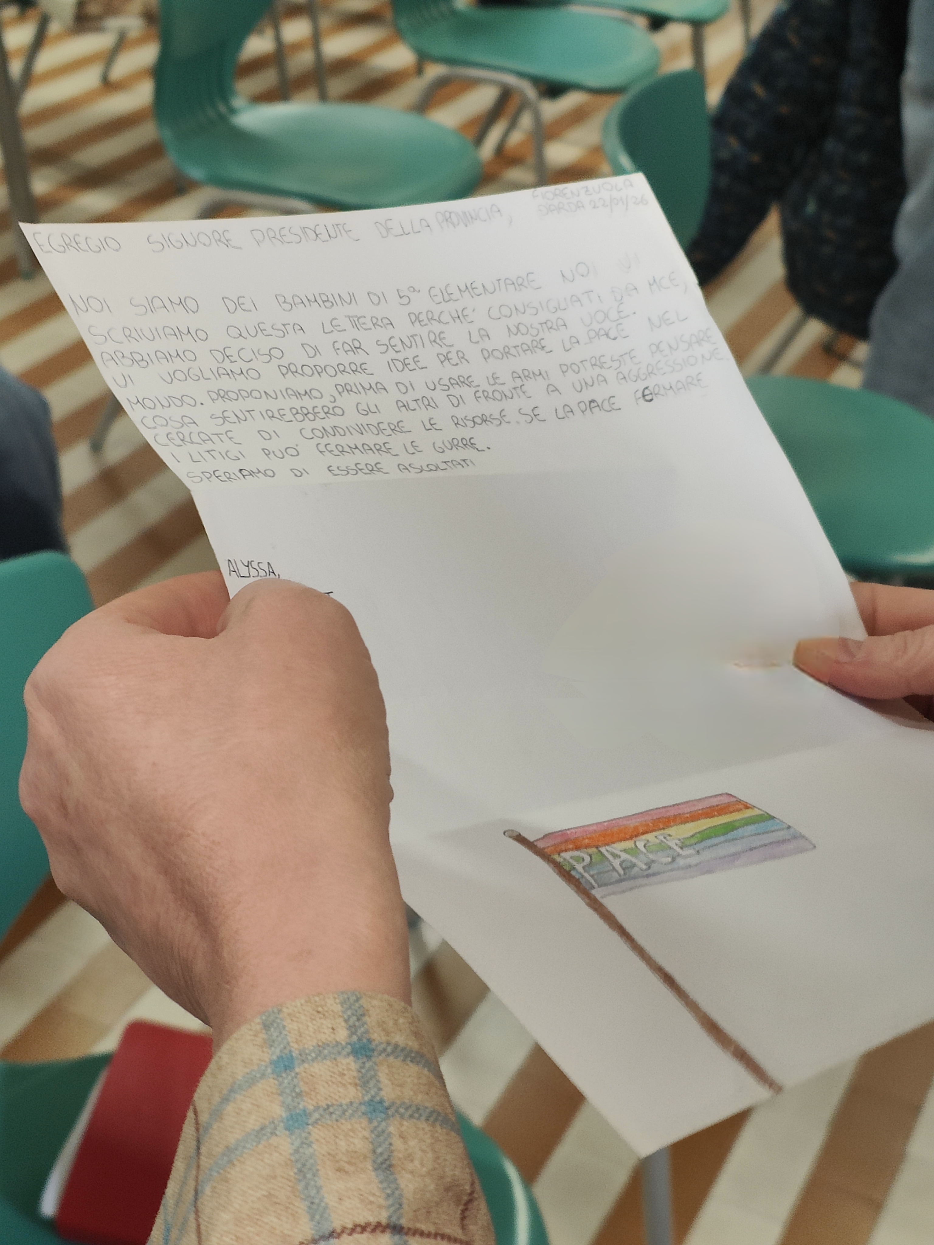 ‹‹Noi come amministratori locali ci dedichiamo a tutelare la nostra comunità e a tutelare la pace del nostro territorio - ha dichiarato Monica Patelli, Presidente della Provincia -. Rispetto alla pace nel mondo, quello che, come amministratori locali, possiamo fare è farci portavoce, insieme, del vostro, nostro messaggio affinché nelle scelte, i potenti del mondo perseguano con convinzione percorsi di pace››. Da qui la proposta del sindaco di Fiorenzuola Romeo Gandolfi che ha rilanciato: ‹‹La guerra è un abominio e la pace è un diritto: potremmo insieme, provincia e sindaci del Piacentino, scrivere una nuova lettera per promuovere la pace››. Don Giuseppe Illica, parroco di Fiorenzuola, ha riflettuto: ‹‹Si potrebbe cominciare anche a pensare all’istituzione di un Ministero della Pace››. Dumque, tante proposte, tutte ancora da elaborare, per promuovere la pace. Alla mattinata hanno preso parte anche la dirigente scolastica Isabella Spurio e la vicepreside, referente della primaria, Maria Grazia Vaccaro.
